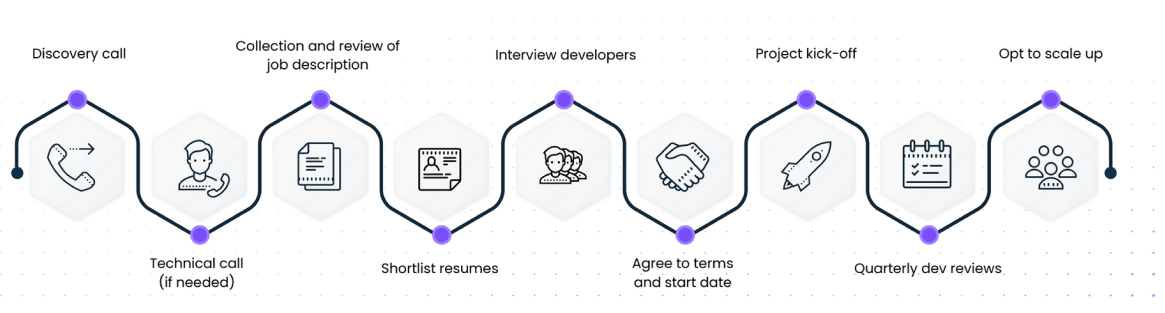 Once you’ve decided on the developers to work with, we simply agree on the collaboration's start date, and voila: your dedicated team is ready to roll up their sleeves and get the ball rolling. We believe scaling a team should be smooth and hassle-free, so we don’t ask for long commitments - our outstanding performance is our guarantee that you’ll stick with us in the long run.